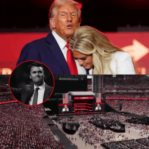 Amidst the sea of faces, President Donald Trump stood prominently, his presence commanding yet somber. The memorial was not just a tribute; it was a moment that encapsulated the essence of American resilience and the shared pain of a nation. As the music swelled, Trump’s gaze fell upon Charlie Kirk’s widow, who was seated a few rows ahead, her face a portrait of grief and despair.